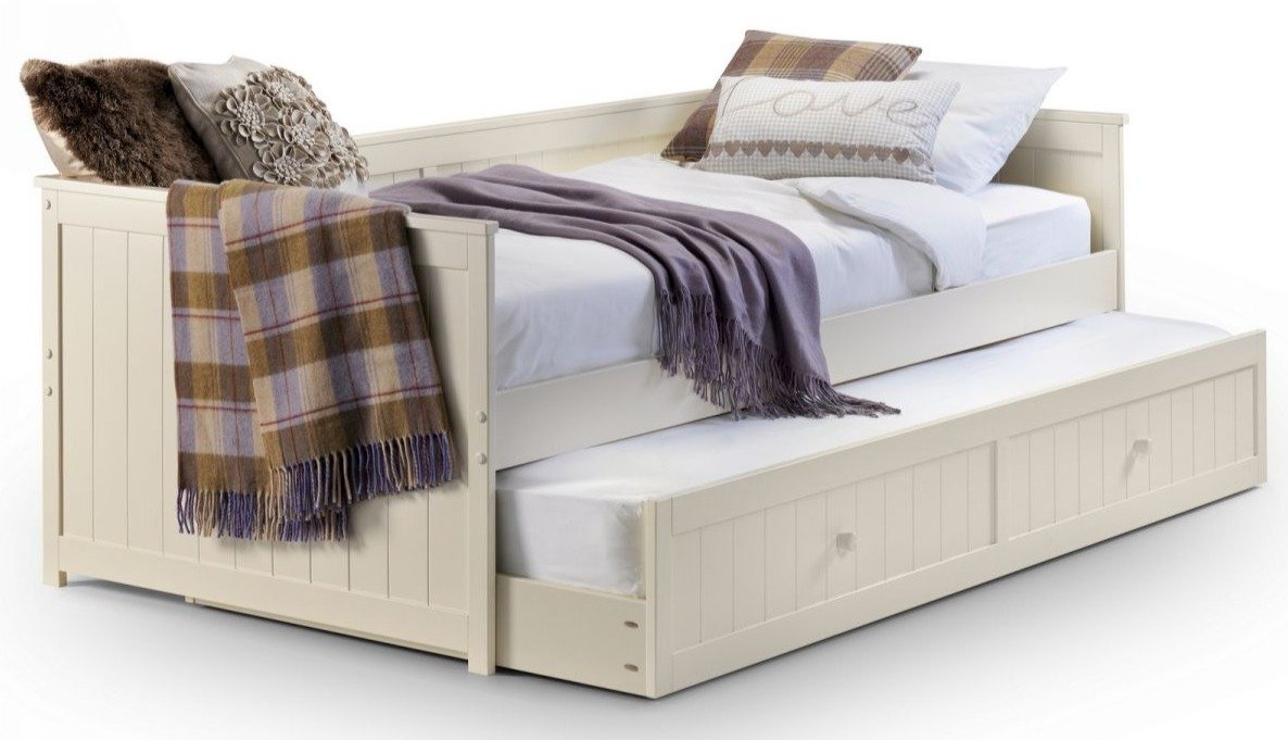 The Josie Daybed and Underbed in stone white satin lacquer with "New England" style fluted panel detailing is the ideal conservatory or guest room solution. A timeless classic offering additional sleeping surfaces that cleverly hide away when not required. Webbed slats ensure added comfort and prolonged mattress life.